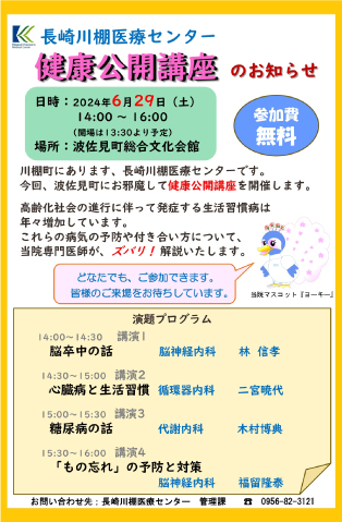 第2回東彼地区公開講座は、令和6年6月29日(土)に波佐見町の総合文化会館『ウェーブホール』で開催しました。あいにくの空模様でしたが、足元の悪い中、多くの方にご来場いただきました。当院の4名の医師による、『脳卒中』『心臓病』『糖尿病』『もの忘れ予防』について、日常生活における注意点なども含んだ講演でしたが、ご来場いただいた皆さんは真剣に耳を傾けていらっしゃいました。