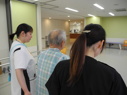 急性期治療が終了し病状が安定した患者さんのリハビリや継続治療が必要な患者さんを受け入れ、在宅に向けての退院支援や調整を行っている病棟です。退院後も患者さん一人一人がその人らしく生活できるよう、患者さんや家族の意向に沿って医師をはじめリハビリスタッフ、メディカルソーシャルワーカー、地域の医療や福祉スタッフ、ケアマネージャーなどの多職種と連携を図り、退院に向けた支援、看護を実践しています。