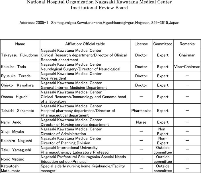 長崎川棚医療センター治験審査委員会委員名簿(英語表記)